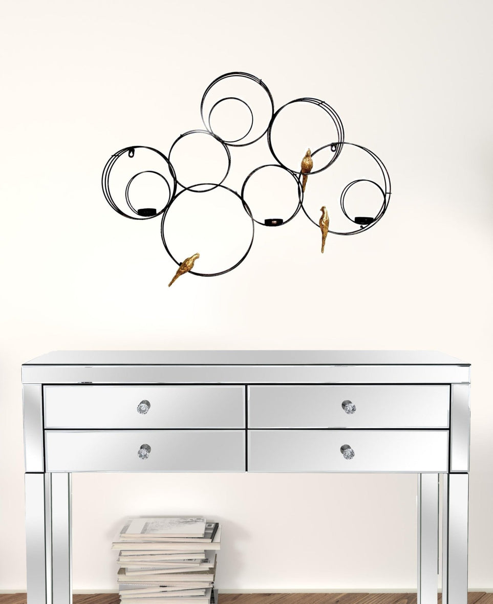 Exceptional Craftsmanship: Constructed from 95% metal and 5% glass, this wall decor boasts an unparalleled durability that promises to be a lasting addition to your home's decor. The intricate design features black geometric circles, artistically arranged to create an abstract masterpiece that captivates and enthralls. Nestled amongst this geometric marvel are three shiny gold birds, each meticulously crafted to catch the light and the eye, imbuing your space with a sense of freedom and the sublime beauty of nature.