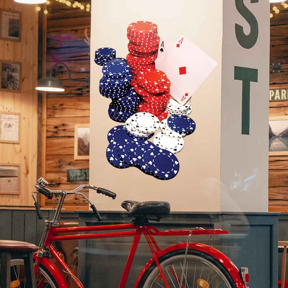 This attractive wall decal is digitally printed and laser die-cut for a perfect finish every time. With poker chips and a pair of aces, this decal captures the spirit of chance with classic gambling visuals. It is printed with water and UV-resistant inks, so you don't have to worry about it fading over time.