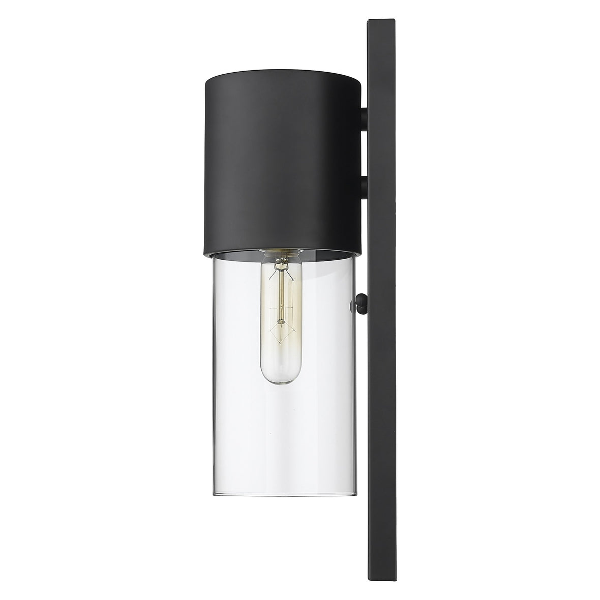 Enhance your living space with the Contemporary Matte Black and Glass Wall Sconce—a modern lighting solution designed for both indoor and outdoor versatility. With its clean matte black finish, sleek rectangular backplate, and clear cylindrical glass shade, this fixture brings elevated style and functionality to any space.