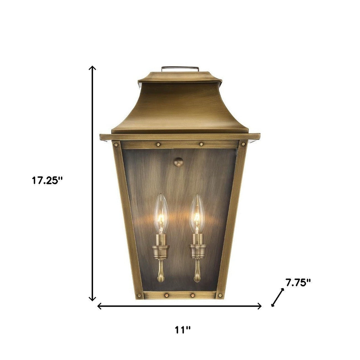 Measuring 11" wide by 17.25" high with a depth of 7.75", this lantern offers a stately presence while maintaining refined proportions. The solid brass frame with a rich aged brass finish evokes heritage charm, while the tapered clear glass panels enhance visibility and elevate the design with understated elegance.
