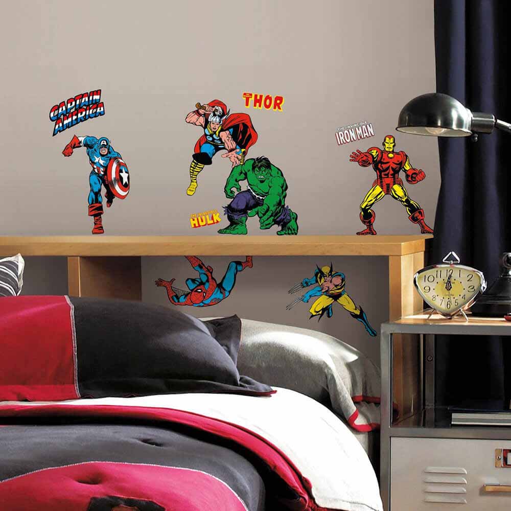 Bring the classic Marvel characters from your favorite comic series into any room in just seconds - 32 decals total ranging in size from 3" to 9"! These high action best selling wall decals of Spider-Man, Captain America, Thor, Wolverine, Iron Man, and more of your favorite superheroes will make any room more exciting. All of the wall decals are removable, repositionable, and reusable, and can be placed on any smooth surface. A great gift for comic book fans! Available only in U.S. and Canada.