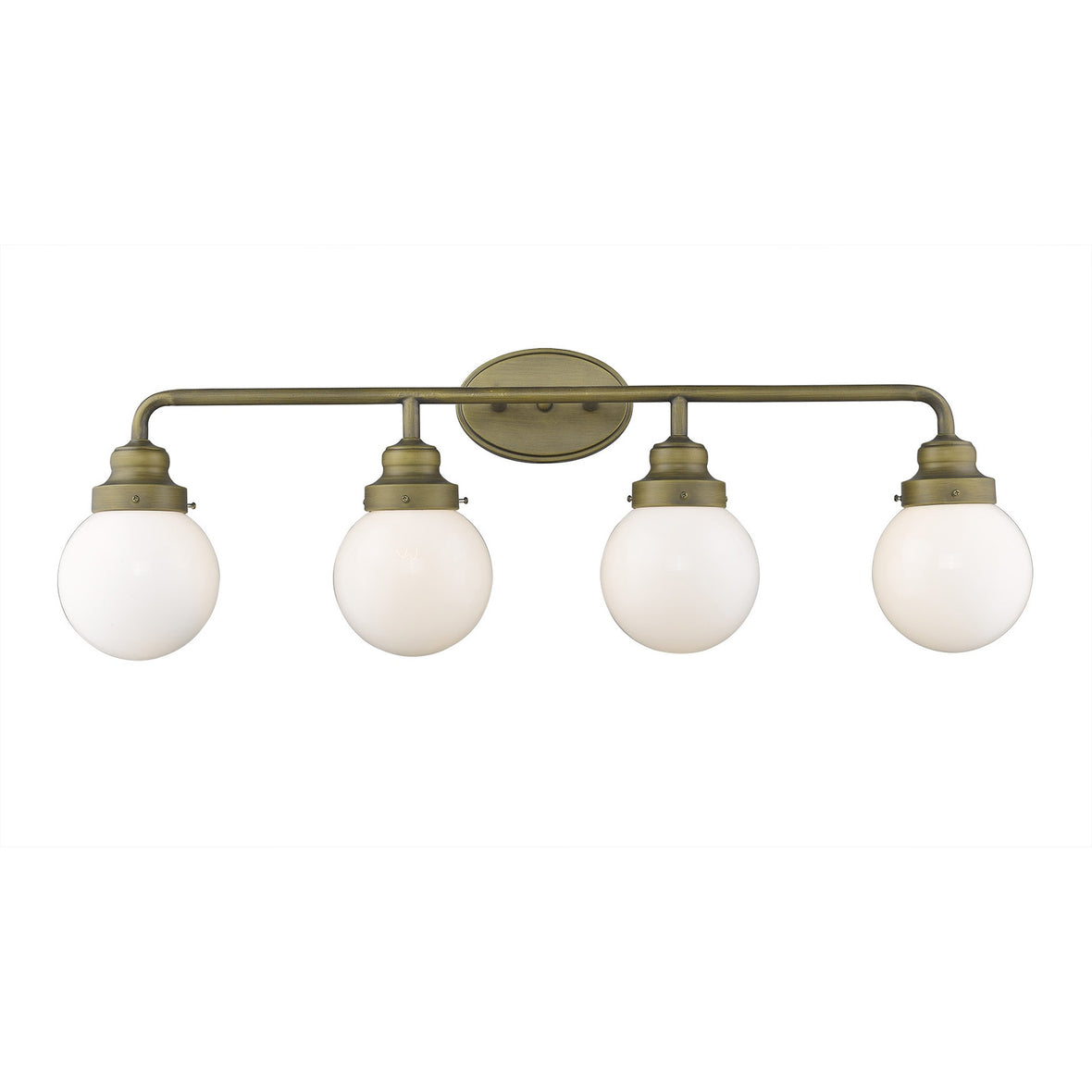 Discover the Portsmith 4-Light Raw Brass Vanity — a striking fusion of retro-inspired bathroom lighting and modern sophistication. Its outreached arms in a raw brass finish support four luminous opal glass globes, casting a warm, inviting glow that flatters both contemporary and traditional interiors.