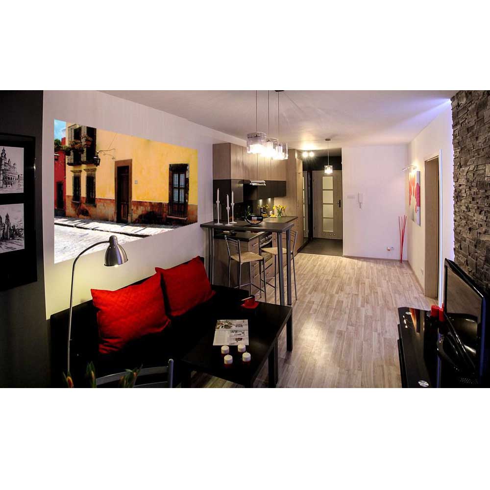 72 inch poster Mexican street and yellow house architecture displayed on a wall in a living room