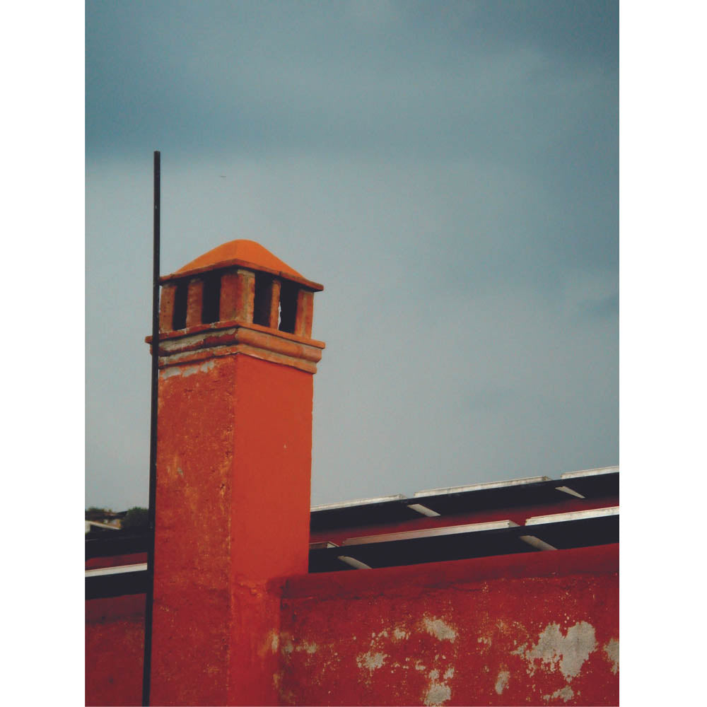 Red brick Mexican chimney against a gray sky wall decal | Wallhogs