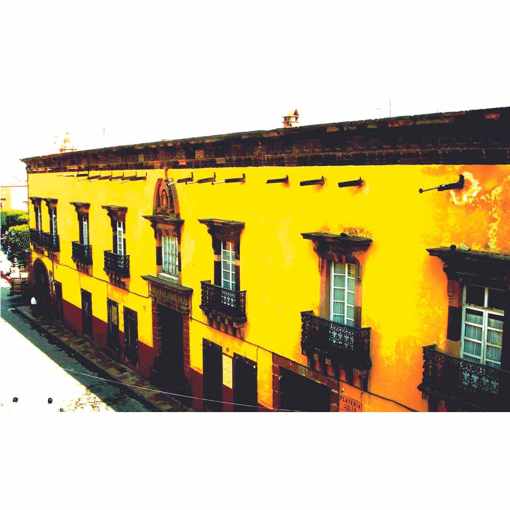 Yellow Mexican hotel with dark brown accents gloss poster printed | Wallhogs