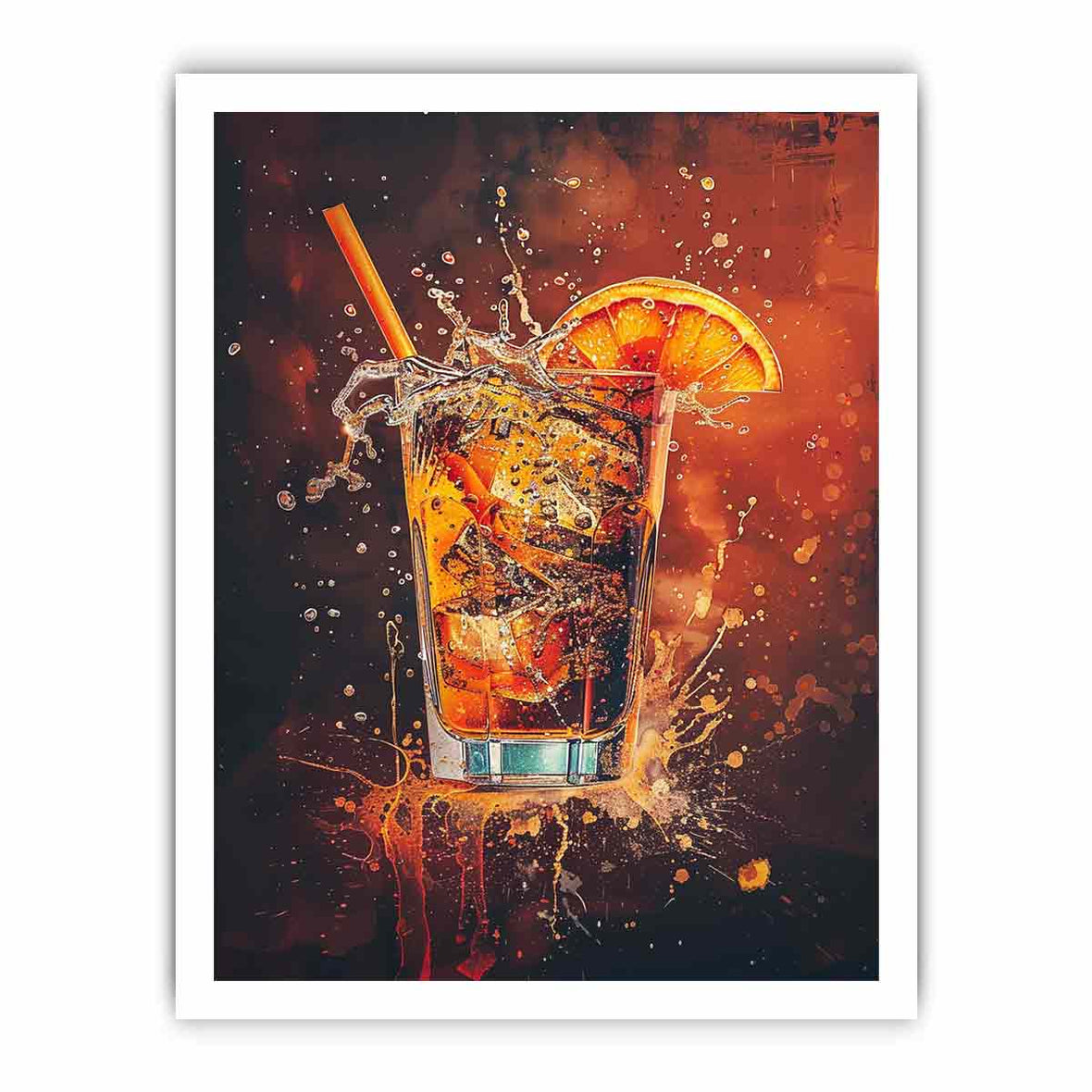 This timeless framed print showcases a classic whiskey cocktail, complete with a floating ice cube and a vibrant orange slice. It's the perfect piece for any bar, man cave, or home office.