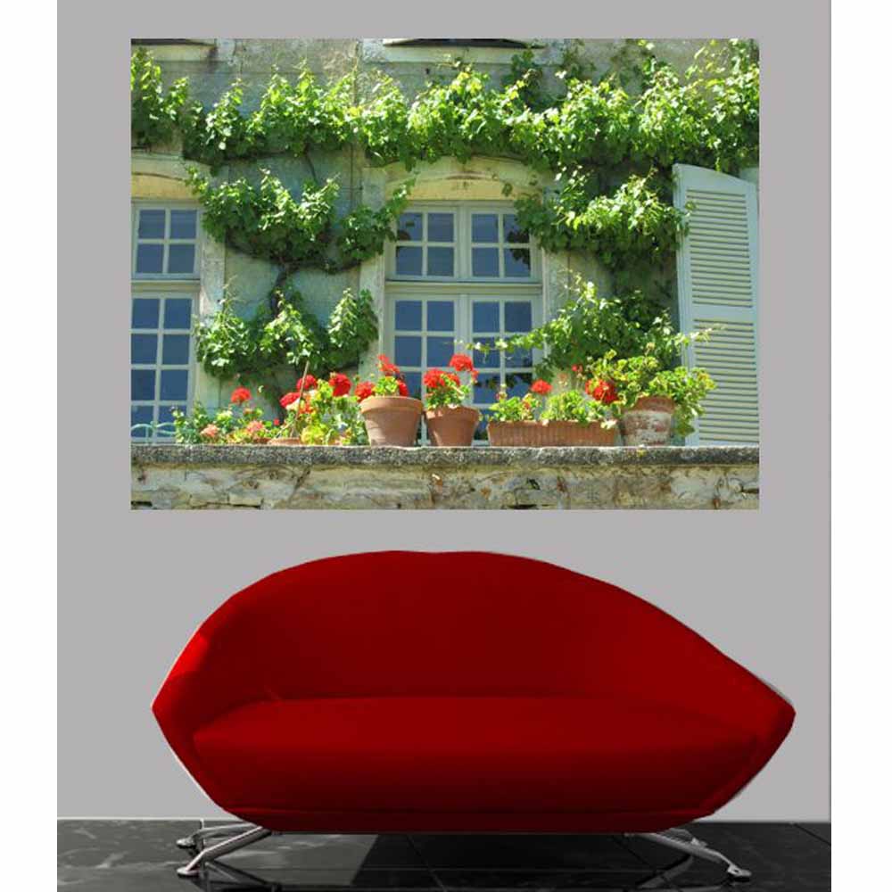 48 inch decorative poster of a window with flowers and greenery, featuring a vase of sunflowers in the foreground on a balcony in Auvillar France.