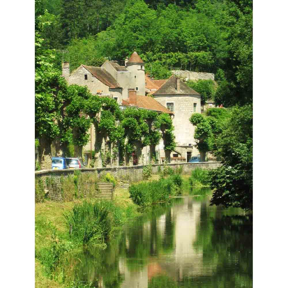 Traditional stone building with a terra cotta roof surrounded by greenery and a river in France wall decal printed | Wallhogs