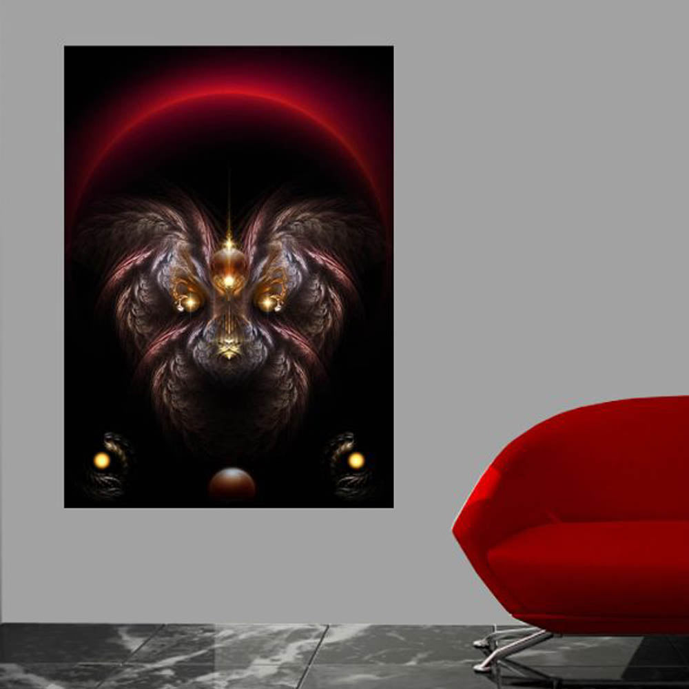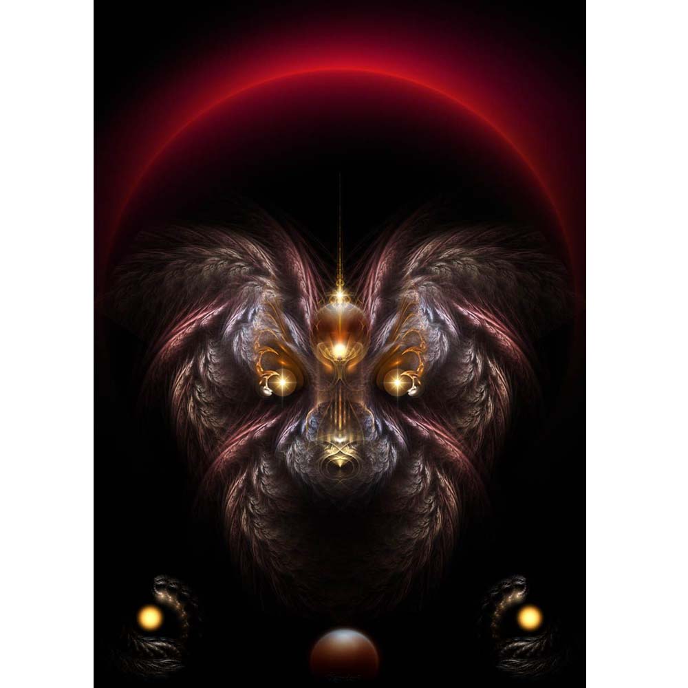 Radiating from the center, fiery golds and ethereal silvers swirl into feathered forms, converging into an almost symmetrical face-like structure that feels alive with mystical energy. Hovering beneath a glowing crimson arc, the artwork draws your eye toward its luminous core—glowing orbs that hint at ancient power and divine intelligence. This piece is a blend of fantasy wall art, sci-fi surrealism, and spiritual abstraction, making it an unforgettable focal point for any modern space.